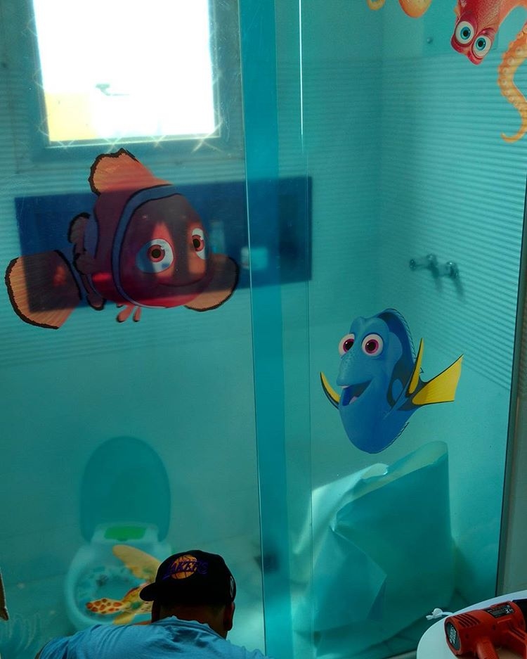 Podemos também fazer tiras com textos, desenhos, logotipos ou até mesmo com impressão de fotos dando um efeito ainda mais especial no seu vidro.